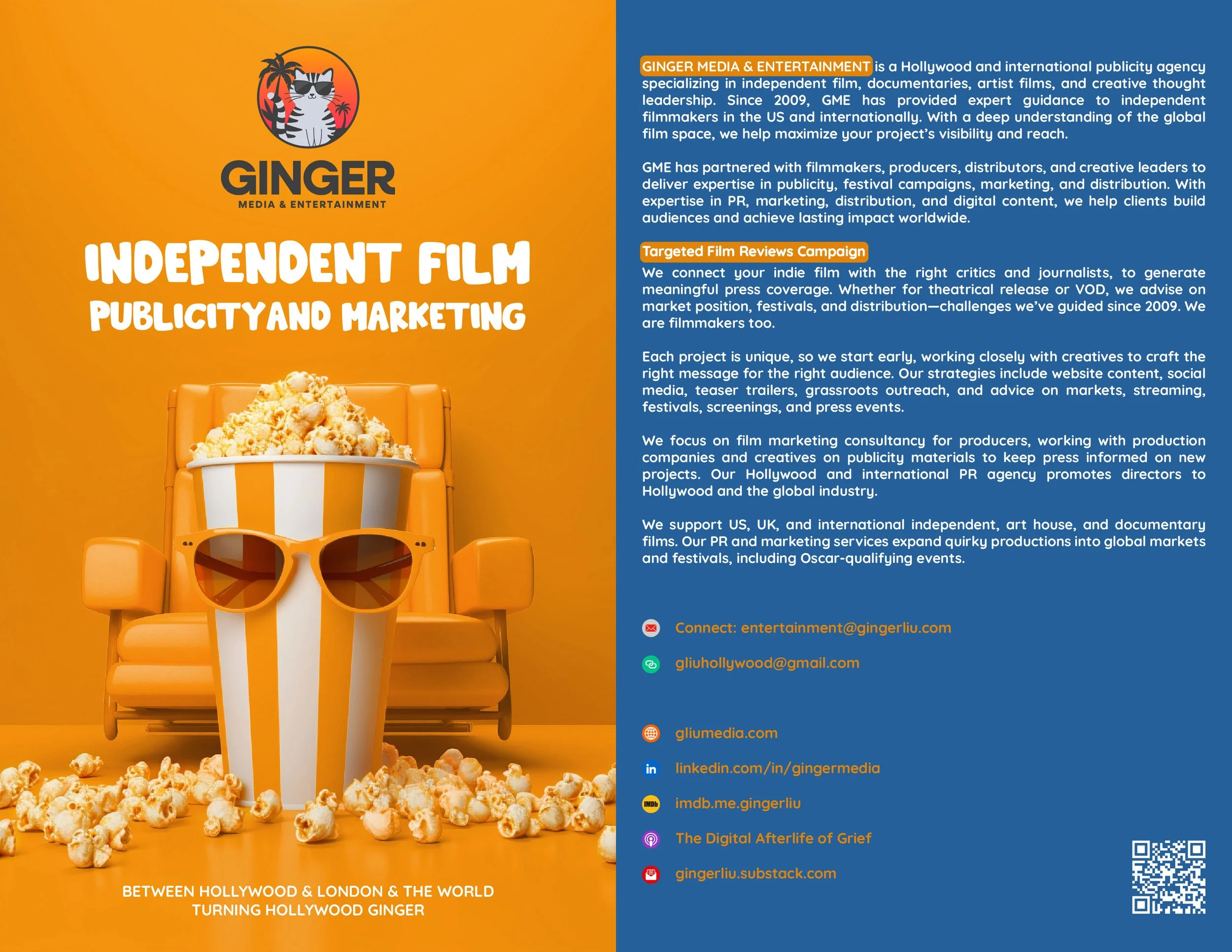 Ginger Media & Entertainment is an independent film public relations and marketing agency that has elevated award-winning films at global festivals and championed independent filmmakers since 2009. With more than 15 years of international experience across media, art, and entertainment, GME partners with filmmakers, producers, distributors, and creative leaders to deliver strategic publicity, festival campaigns, multi-platform film releases, and marketing. GME also secures high-impact podcast interviews and speaking engagements, developing compelling thought leadership strategies for entertainment and visual media technology.